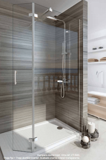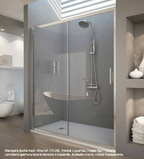 Mampara vidrio templado 6mm, perfil anodizado cromo brillo, puerta abatible interior y exterior, brazo telecópico incluido, sistema antical.