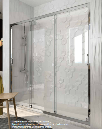 Mampara vidrio templado 6mm, perfil anodizado cromo brillo, rodamientos metálicos superiores, patines metálicos inferiores, sistema corredero en ambos sentidos, sistema antical, instalación con perfiles de espansión por presión.
